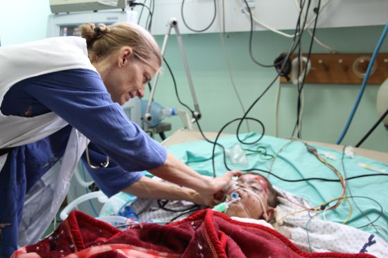 Tras la operación fue ingresado en cuidados intensivos en la Unidad de Quemados del hospital Al-Shifa. Una pequeña herida preocupaba especialmente a Kelly, otra anestesista integrada en el equipo de emergencia de MSF. "Se trataba de un pequeño corte en la barriga que no paraba de sangrar", explica Kelly. "Solicité un escáner de su abdomen y vi que tenía una hemorragia interna. Los fragmentos de la bomba habían causado siete perforaciones en su intestino delgado. Kelly le salvó la vida con esa decisión", exclama Adriana.